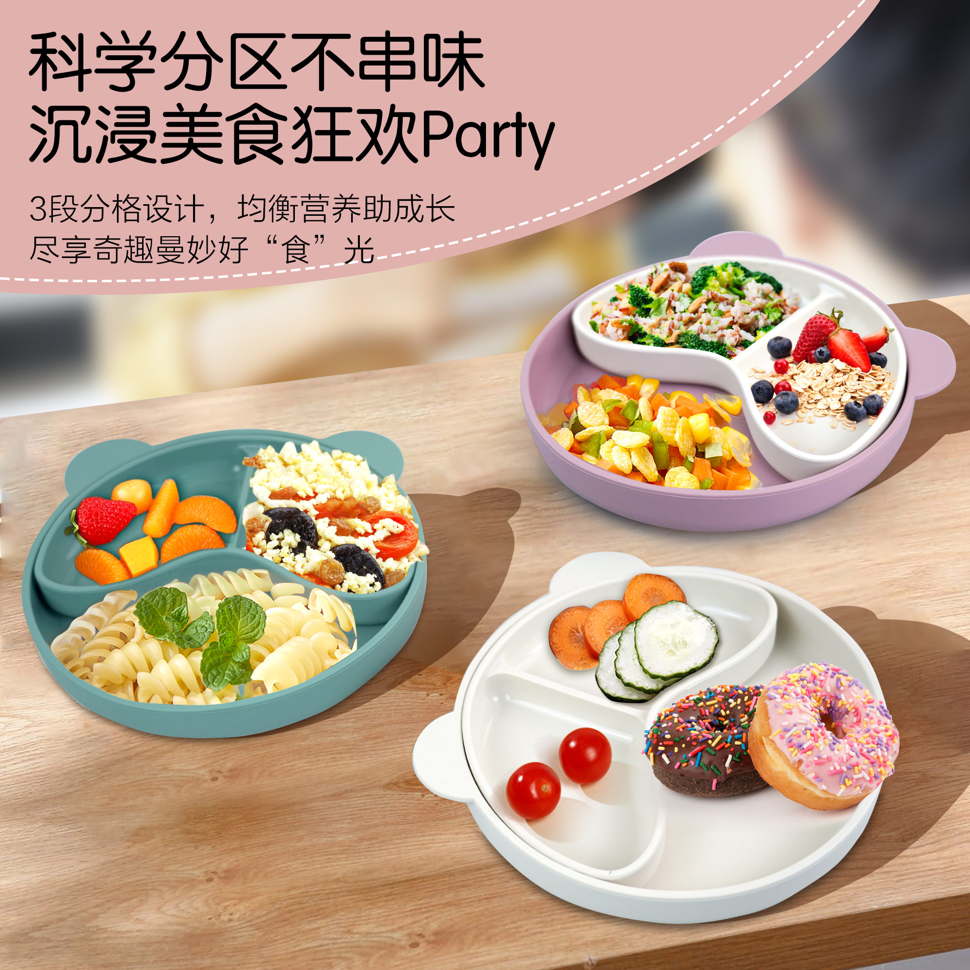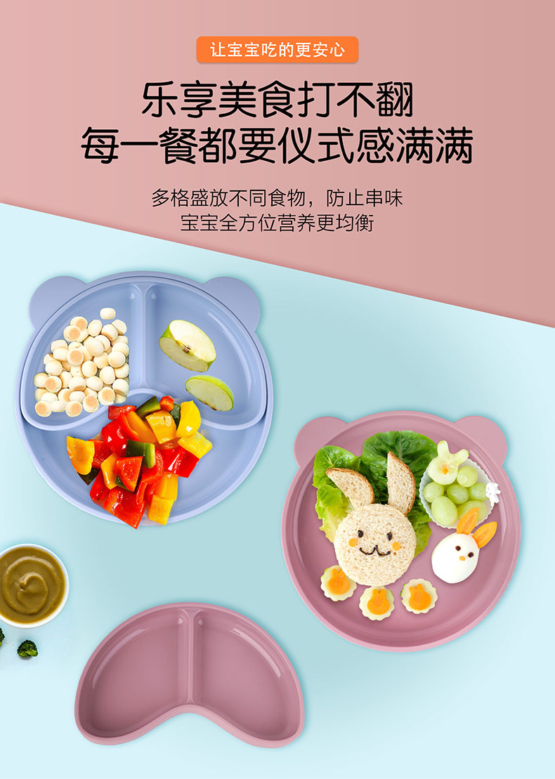 寶寶熱銷餐盤可拆分食品級硅膠分隔盤輔食吸盤三格兒童硅膠餐盤
