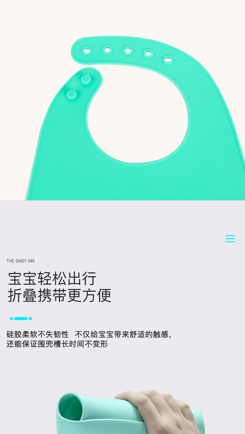 科泰利所生產(chǎn)的硅膠圍嘴兜,選用食品級(jí)環(huán)保原材料制作,材質(zhì)可以信賴,它由科泰利硅膠制品廠家經(jīng)過200多度高溫加工成型,耐溫防水防油,清潔方便,水沖即可,可以反復(fù)使用。而且硅膠圍兜現(xiàn)在普遍采用3D立體設(shè)計(jì),凹槽可以輕松兜住食物,這樣的設(shè)計(jì)就是在存放的時(shí)候比棉質(zhì)占空間。此外硅膠除了作為圍嘴兜也一樣可以做其他嬰童硅膠制品。